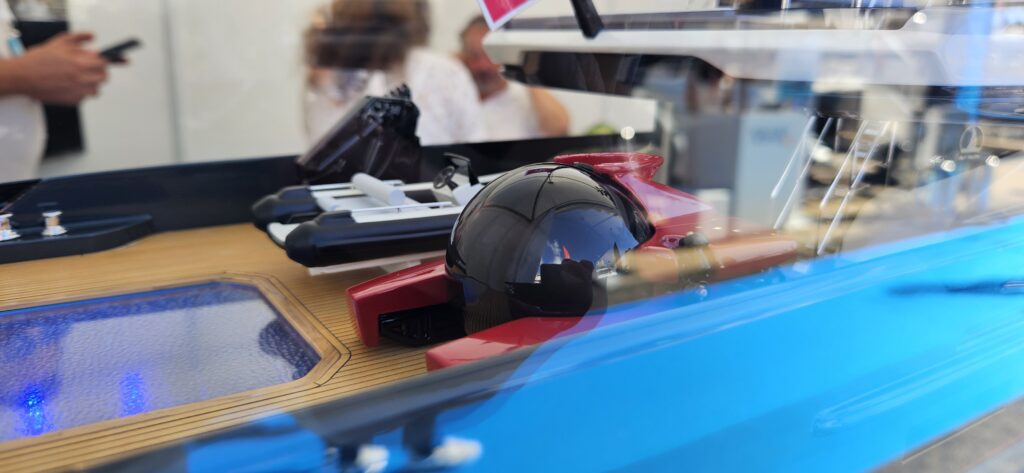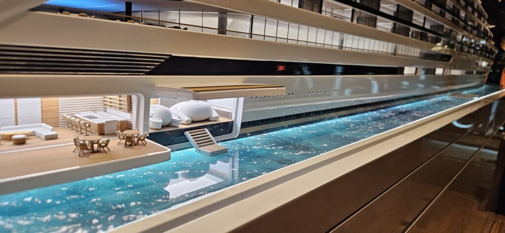 A large scale model was on display at the Monaco Yacht Show, showcasing the two Triton submarines in the starboard stern garage.